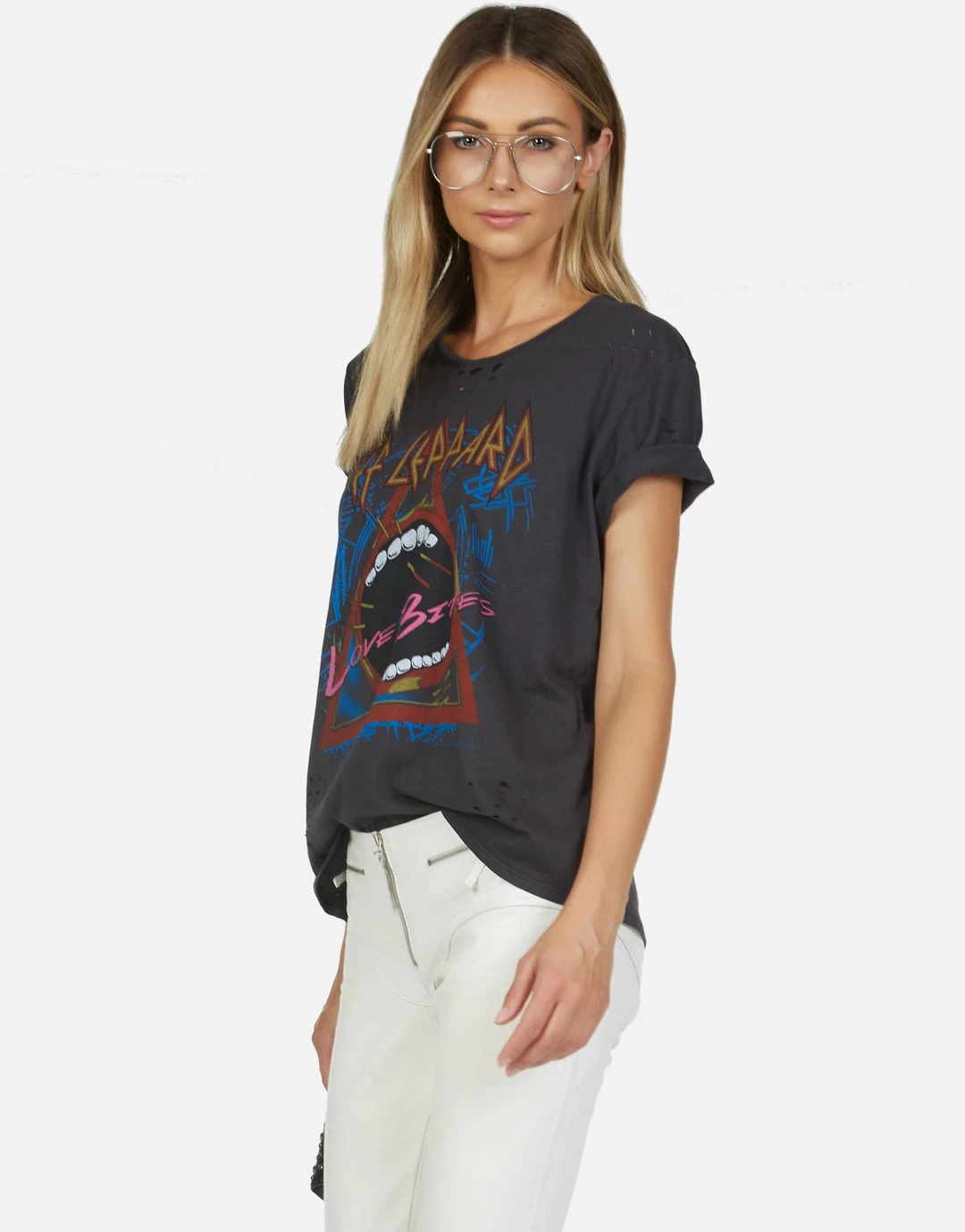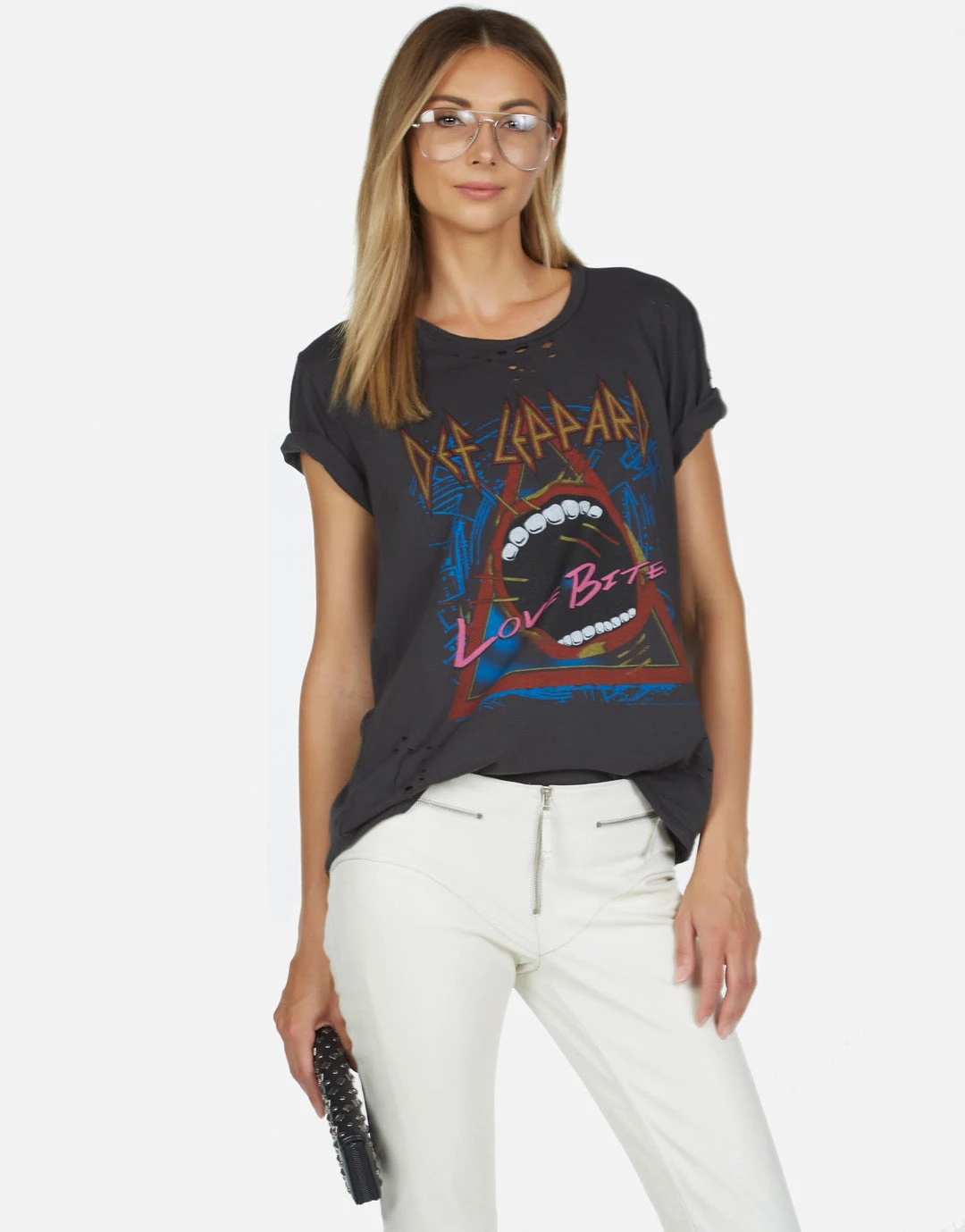 Def Leppard Love Bites Printed on Ultra Soft Lightweight Tee in Onyx by Lauren Moshi.