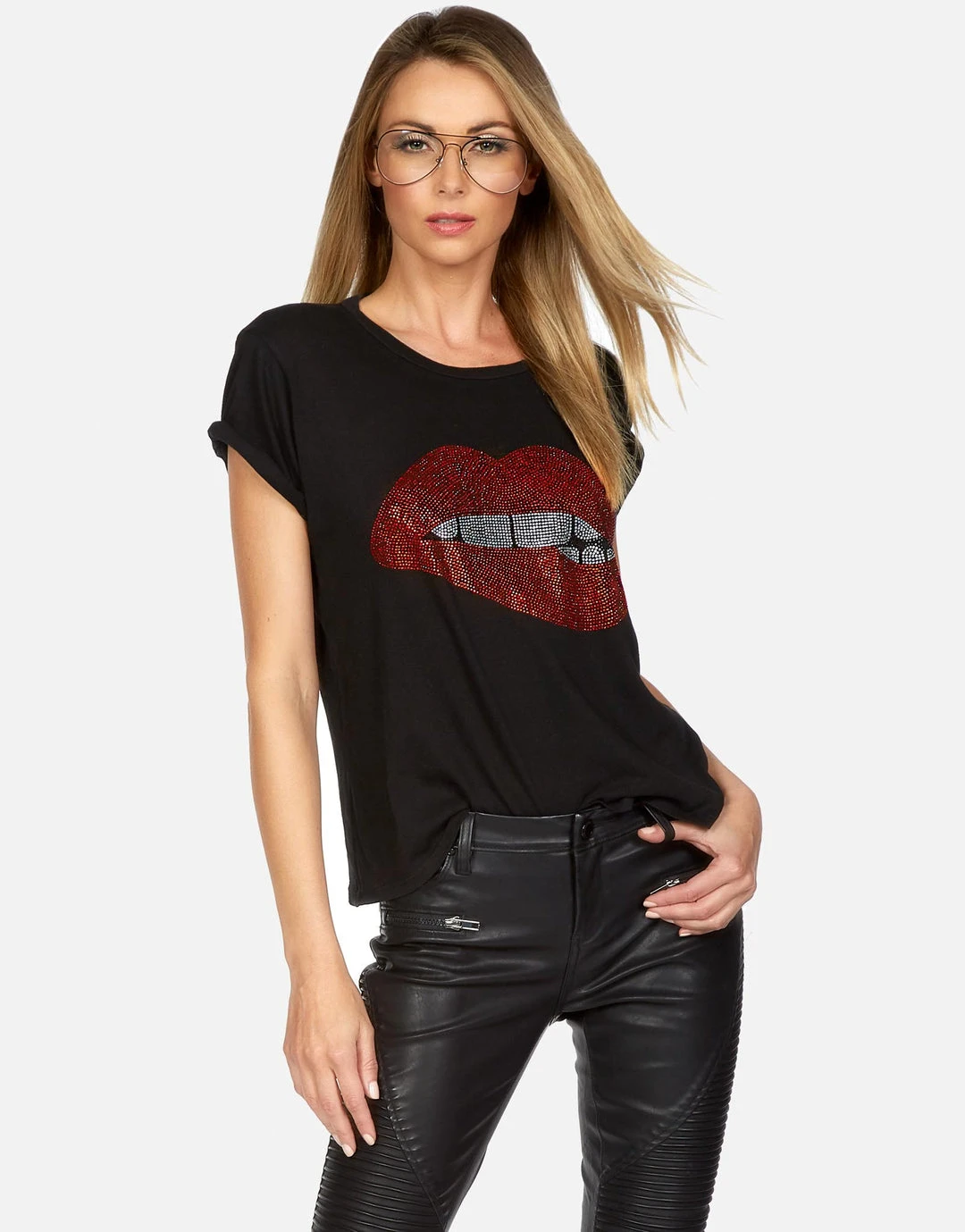 WEB EXCLUSIVE | Crystal Biting Lip Printed on Ultra Soft Lightweight Tee in Black by Lauren Moshi.