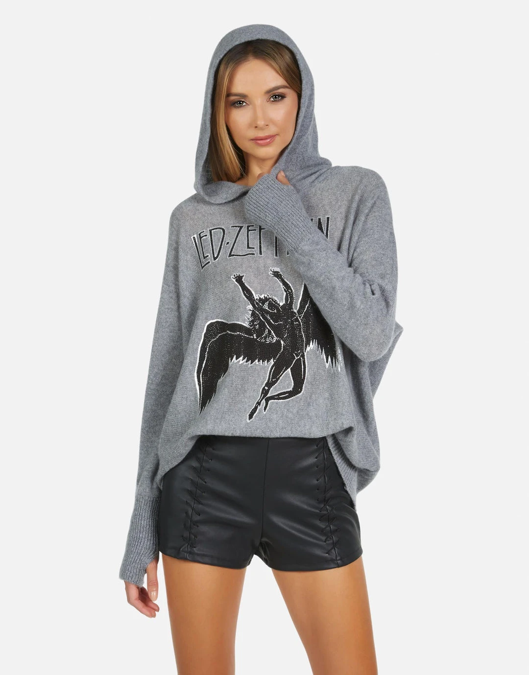 Led Zeppelin Printed on Ultra Soft Lightweight Cashmere Hoodie in Charcoal by Lauren Moshi.